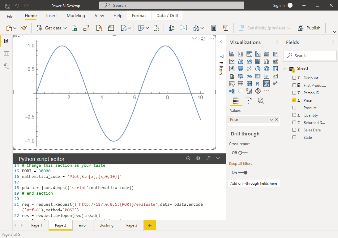 You should also provide at least one Field to be able to write python code so here I'll import a sample data file and drag Price Field to Python Visual's Values section. If you need any field in your calculation, drag them into Values section.