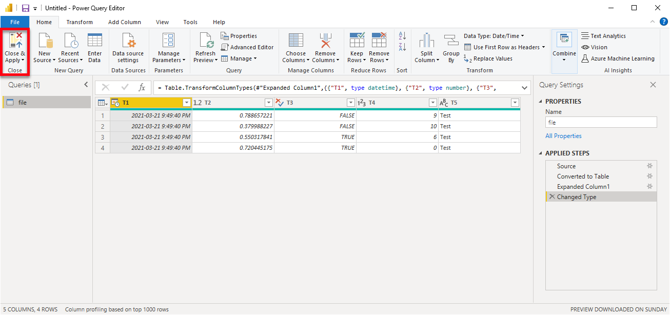 In the Power Query Editor you can preview your data, here data consists of 5 columns with different types (Date, Float, Boolean, Integer, String):