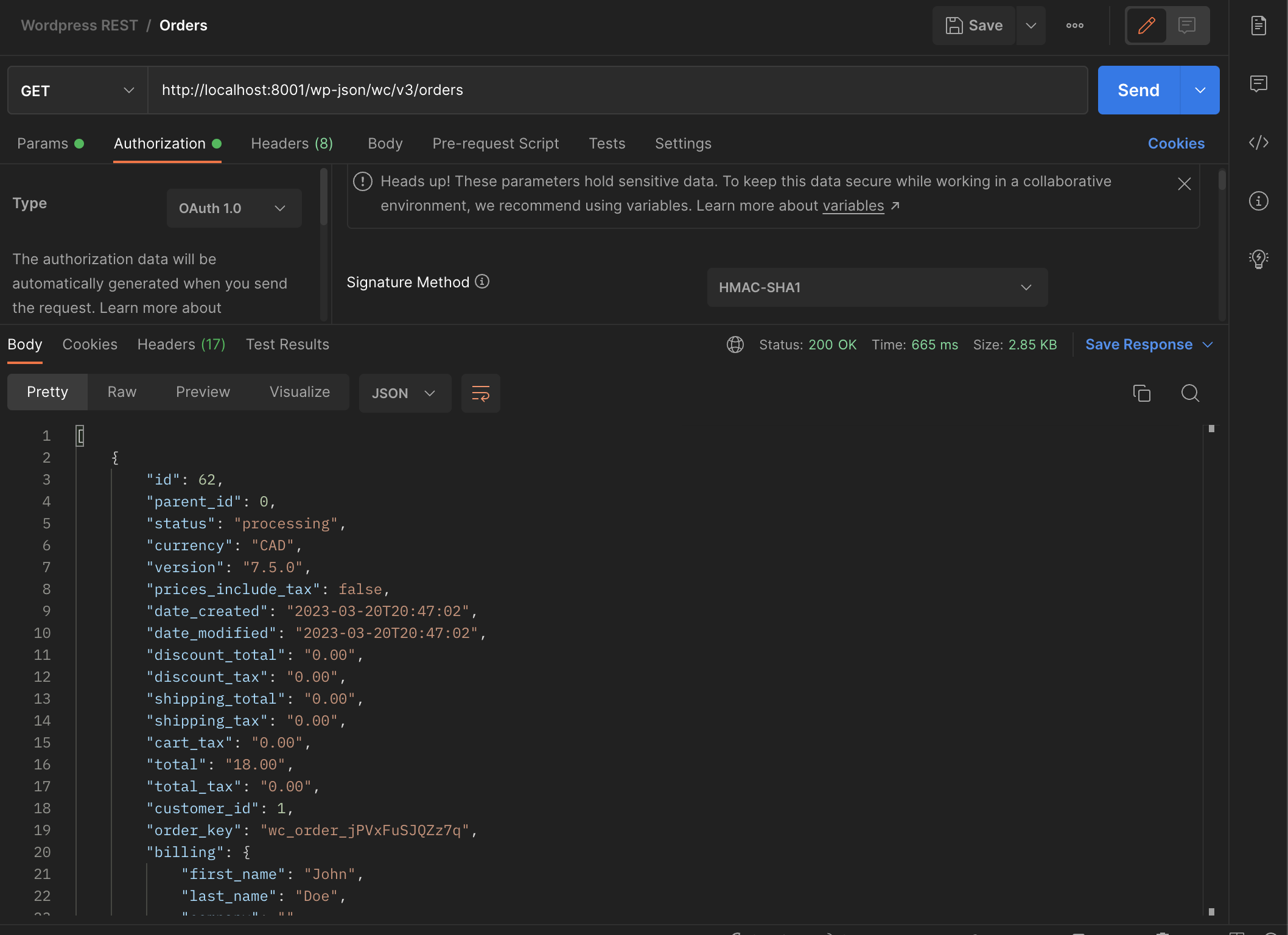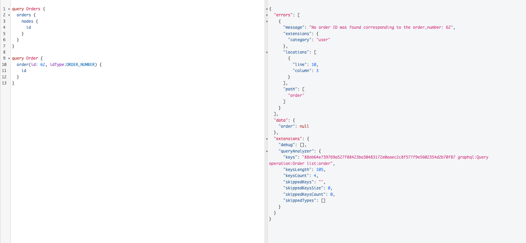 http://localhost:8001/and initialize wordpress. Install most recent version of plugins (see plugins versions section), initialize commerce, add products (I used the sample data fromwp-content/plugins/woocommerce/sample-data/sample_products.csv) and a payment method (I used de defaultCash on delivery), make an order, try to query to retrieve said order, see error. Is this a regression or maybe I'm missing a configuration step?Expected behavior